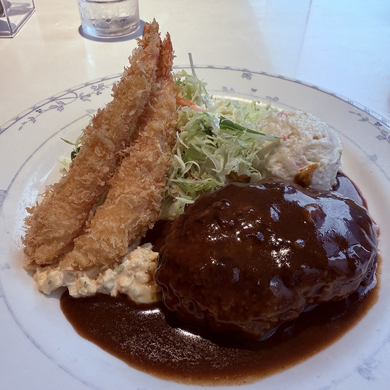 ハンバーグとフライのセットで揚げ物は自由に選択できる。今回はエビフライに。