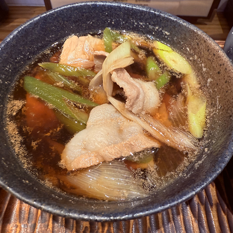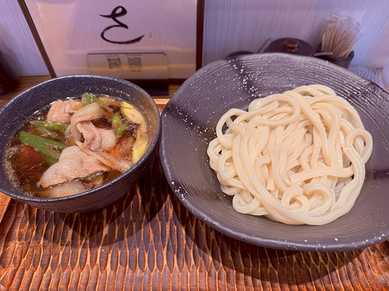つけ汁は出汁の旨味に豚とネギの甘みが加わってバランスよく、うどんとの相性もいい。