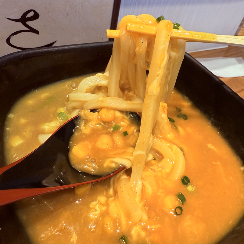 とろけるチーズとコーンが入ったカレーベースの餡掛けうどん。