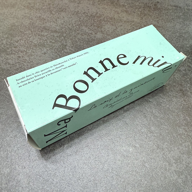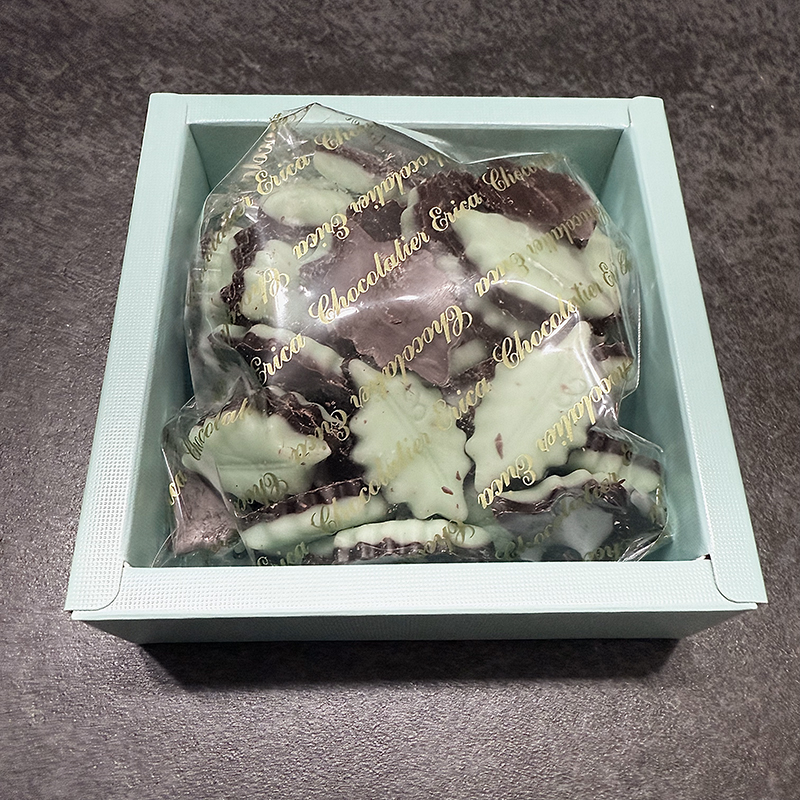木の葉型したチョコでミントチョコとブラックチョコが半分ずつになっている。ブラックチョコは マ·ボンヌよりチョコがビターでミントチョコの爽やかさとウェルバランス。ウイスキーのつまみにもいい。