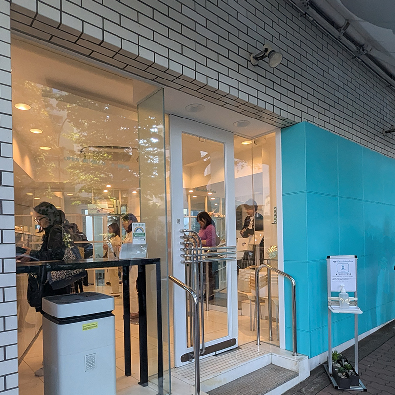 プラチナ通りに古くからあるショコラティエ。ミントグリーンの鮮やかな外装が目印。