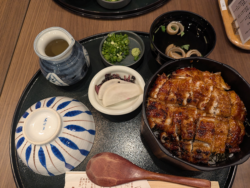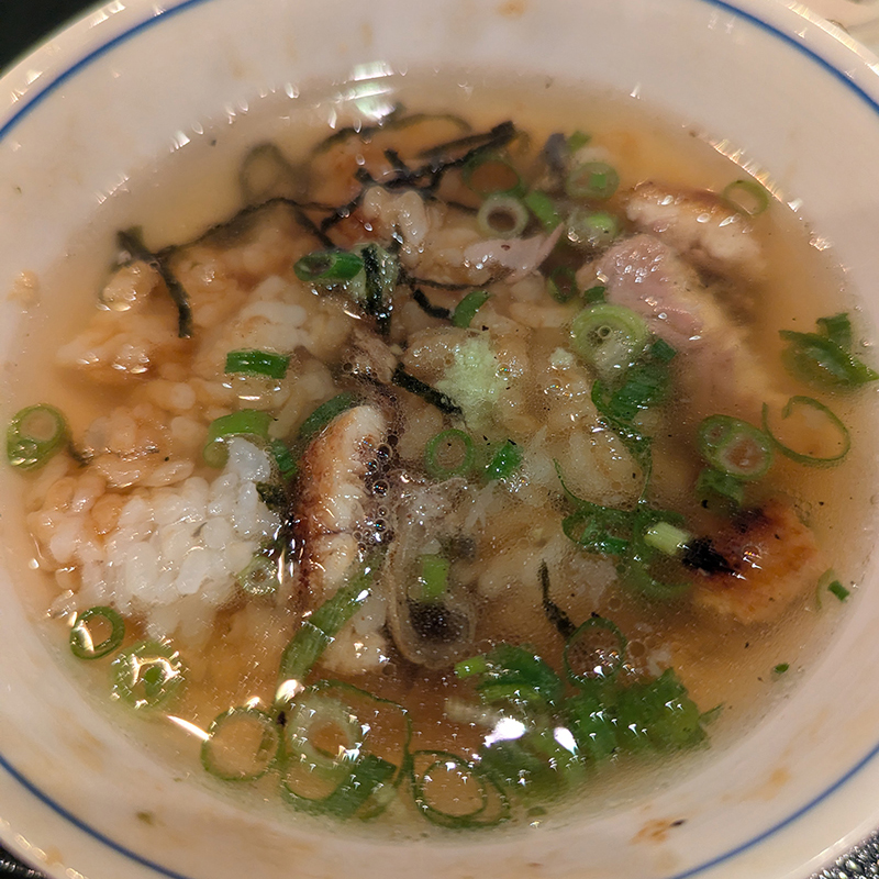 最後はだし汁を掛けて。結論から言えばこの最終形態が一番いい。うなぎそのものの味わいが薄れる代わりにタレの甘さも気にならない。出し汁そのもののも美味しい。