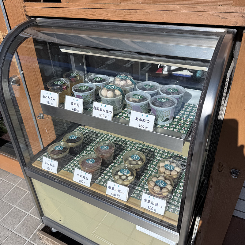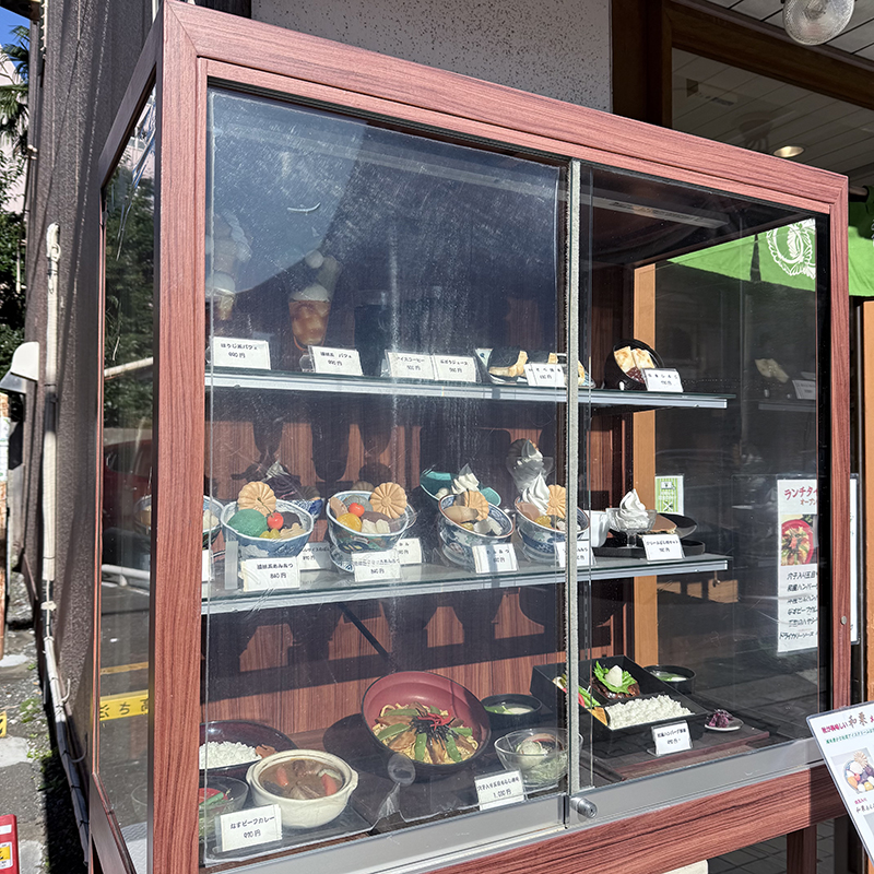入口の扉の左手には昔ながらの食品サンプルが飾られていて、右手はテイクアウトコーナーになっている。