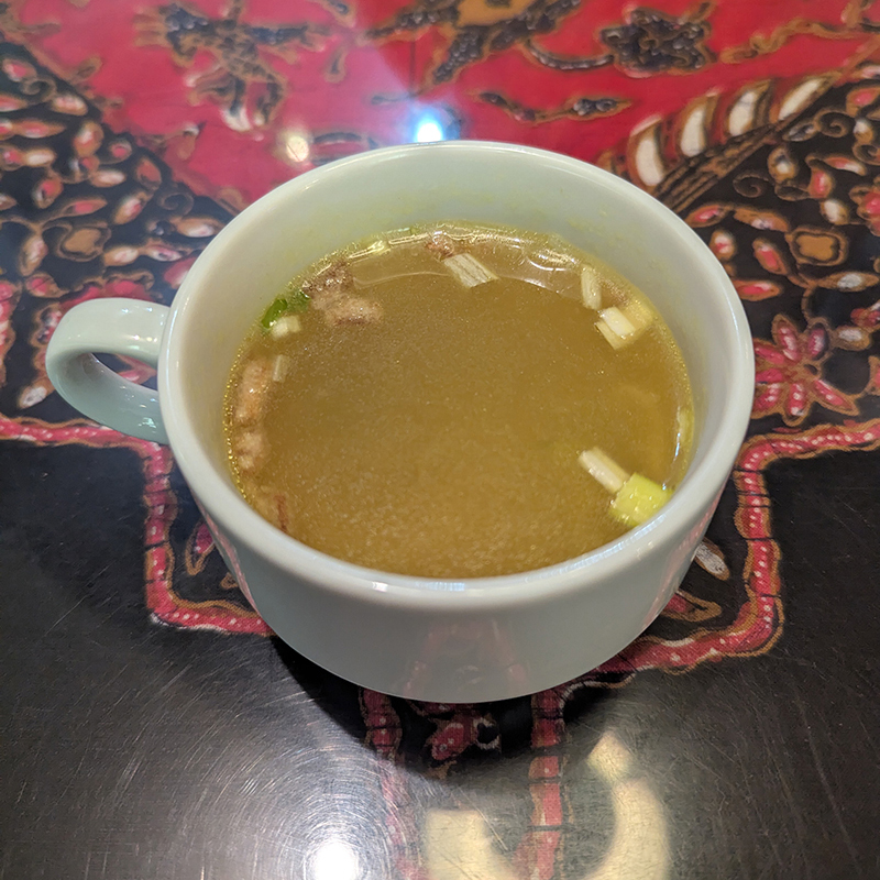 注文を済ますと最初に運ばれくるのがセットのスープ。サラリとしたスープなのだが、スパイシーで滋味深い。カレーに近い風味なのだが実に個性的。