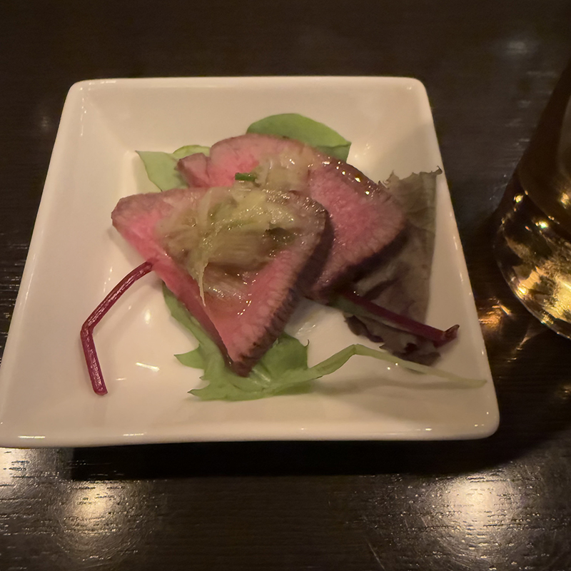 お酒は各種揃うがワイン押しの様子。まずはビールを頂きながらお通しのローストポークを。