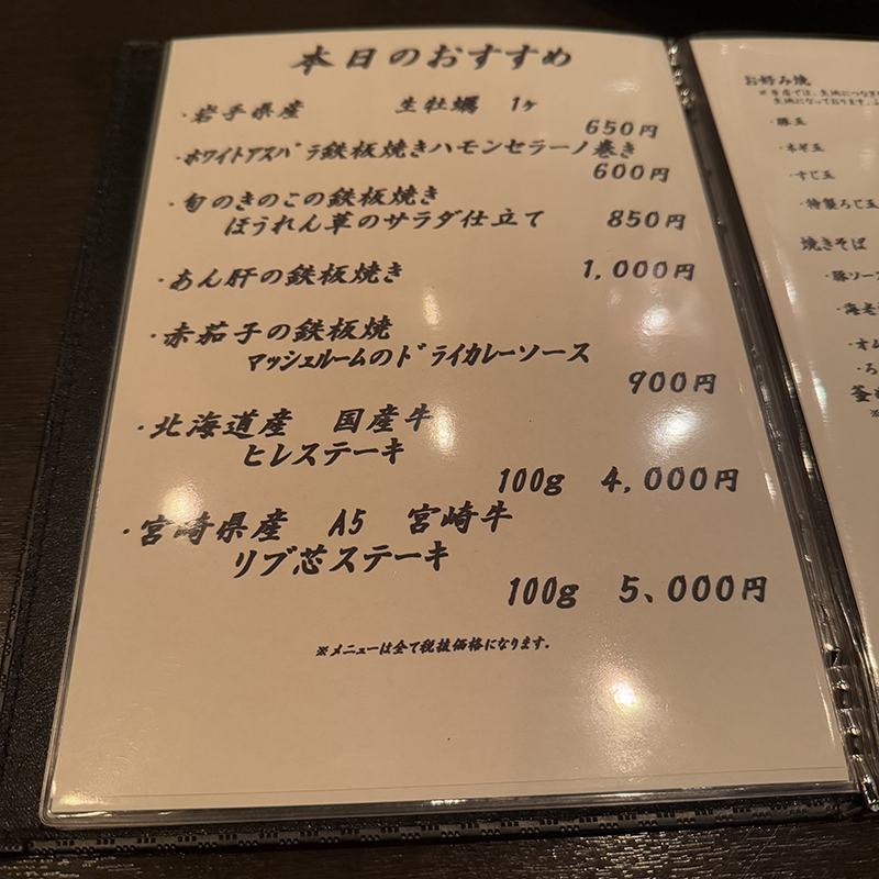 お店の前に出ていたメニューからステーキ中心なのかと思っていたらそうでもない。本日のおすすめにはステーキもあるが、定番メニューではお好み焼きや焼きそば等もメニューを飾る。