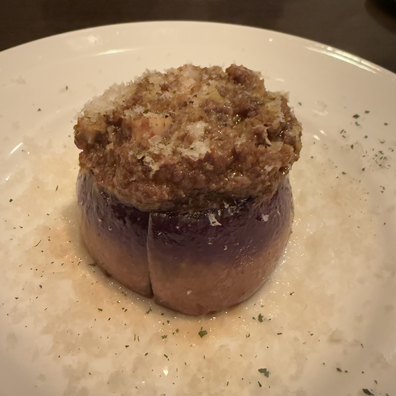 厚めの茄子にじっくりと火を入れて中はトロトロに。上にはマッシュルームのドライカレーソースが乗る。素材の組み合わせのセンスの良さが光る。