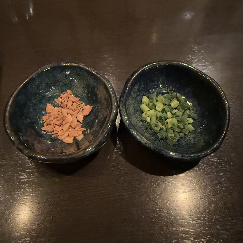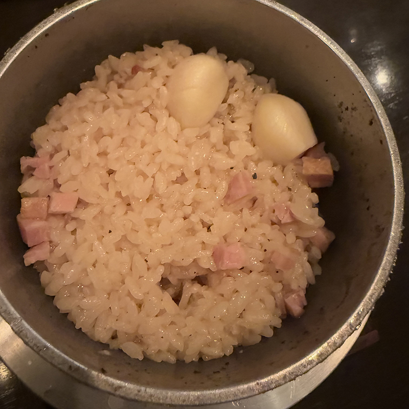 生のニンニク、ベーコンと共に炊く。米は粒立ちがよくこれだけでも普通に美味しいのだが、後からガーリックチップとネギを散らして頂くとガーリックライス的な味わいに。