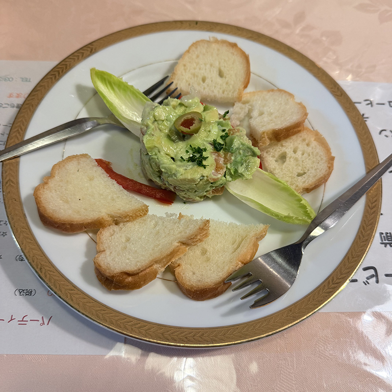 鮮やかな色彩が食欲をそそる。アボガドのねっとりとした食感と帆立、サーモンがバランス良く収まっていてクリーミーで軽やか。こちらは添えられたバケットと一緒に頂く。