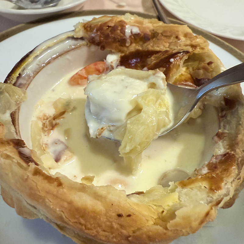 サクッとした食感のパイの中に白身魚、帆立、海老、牡蠣が入る。