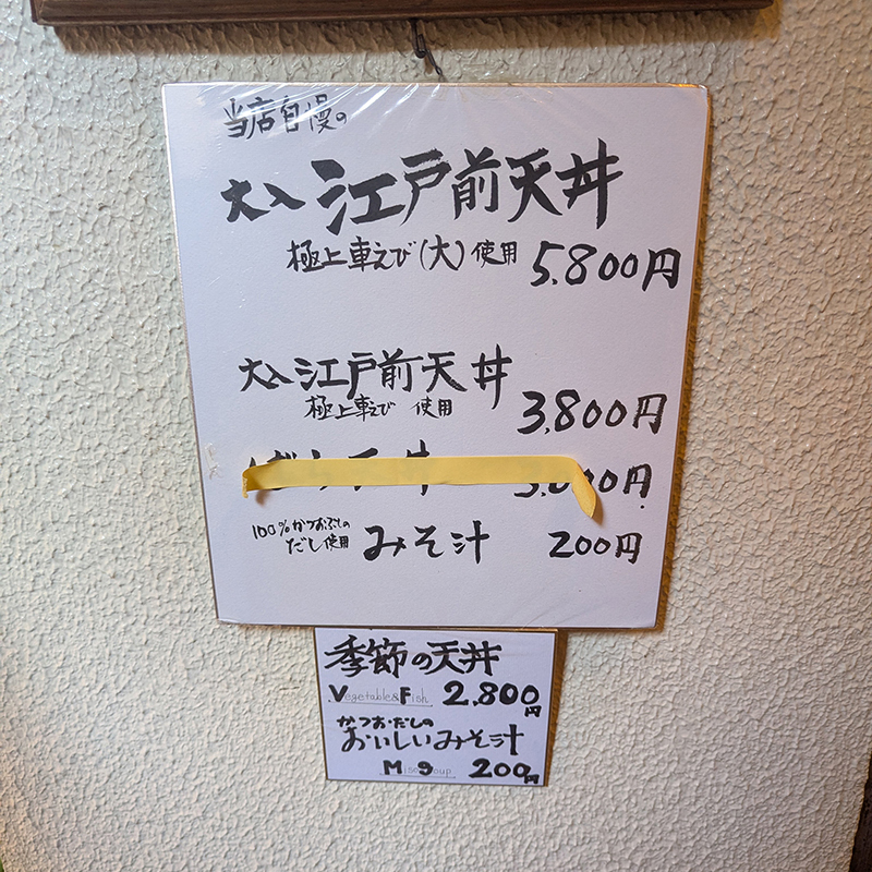 メニューは天丼のみ。車海老の種類によってメニューが分かれている。
