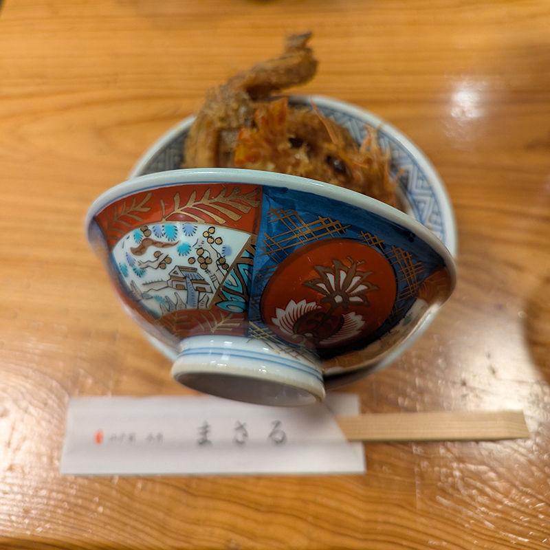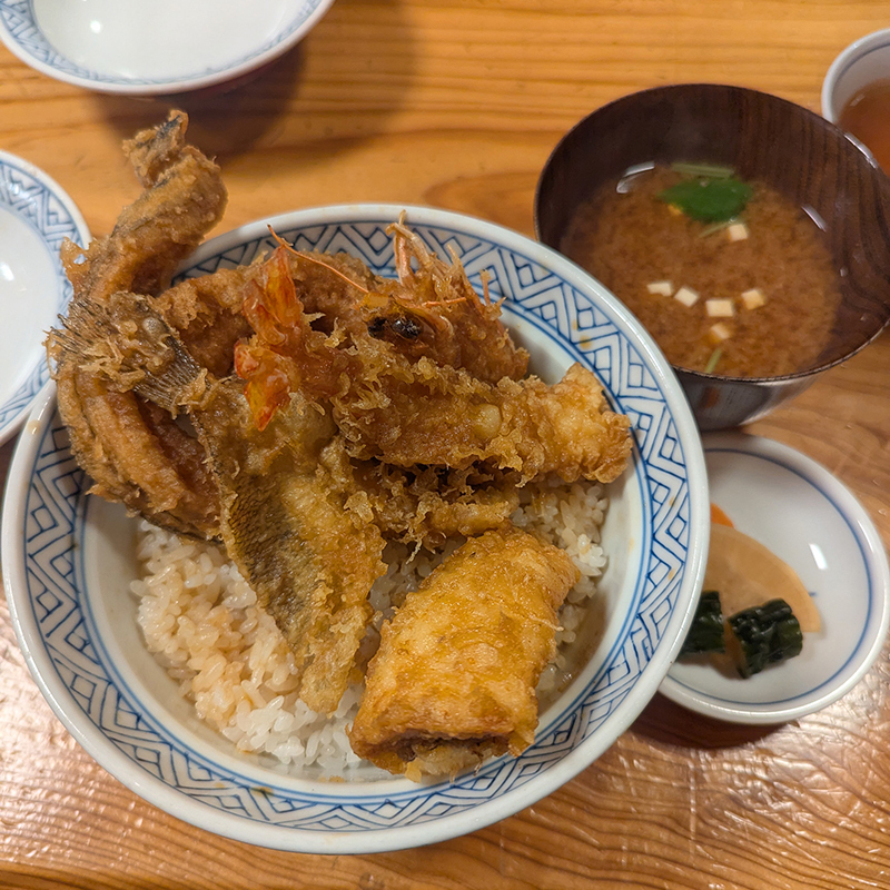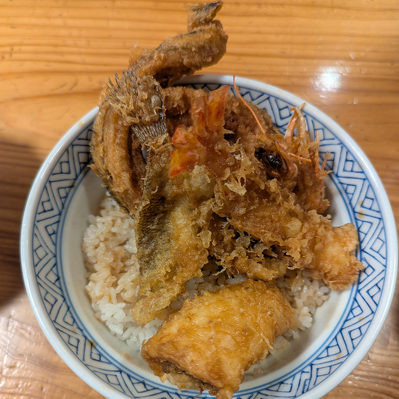 具材は車海老、穴子、めごち、はぜという構成で野菜は使用せず魚介類のみ。そのせいか、丼には隙間があって少し寂しい印象を受ける。