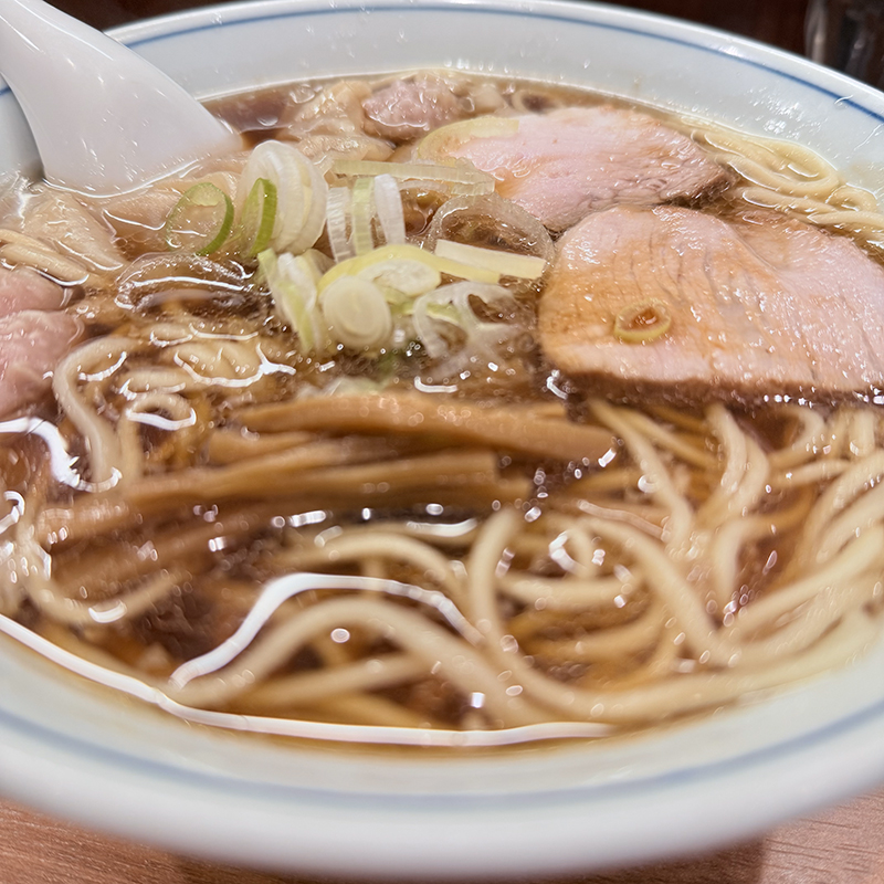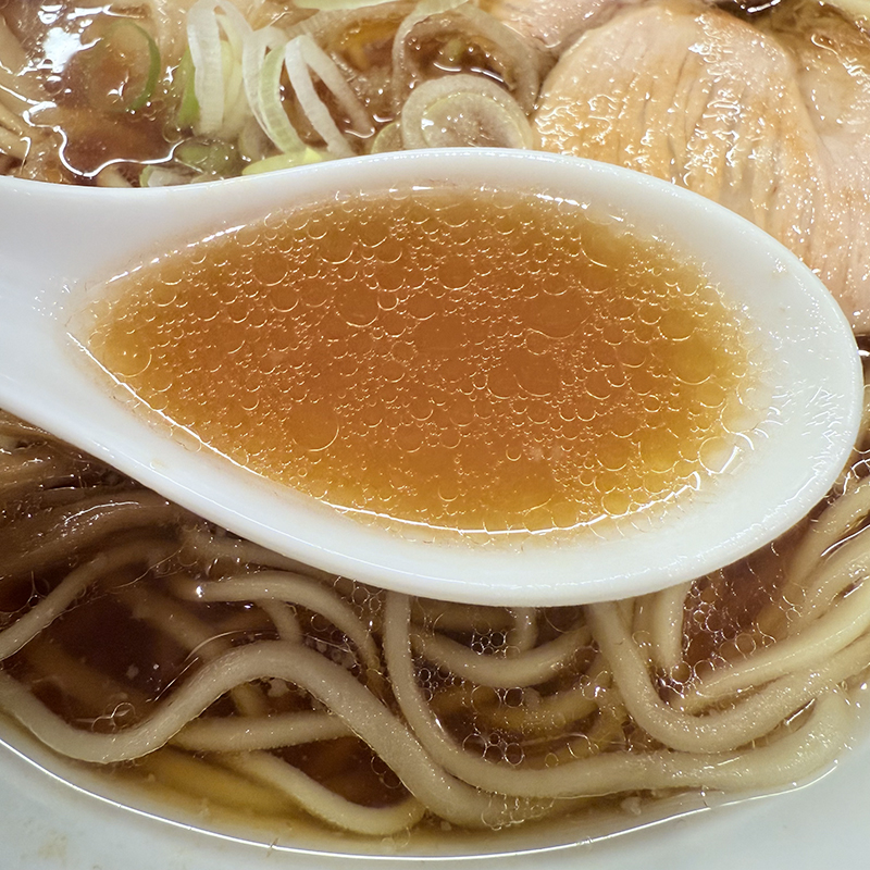レンゲで掬ってみるとそれほど濃くはなくデフォルトの様に感じた。すっきりと澄んだスープは魚介系がほどよく香る。