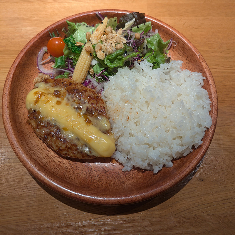 ワンプレートにハンバーグ、サラダ、ライスが収まったスタイルで供される。