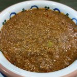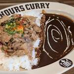 ギュウスジすきやきカレーは牛すじを煮込んでビーフストックにし、上に牛すじとこんにゃくのすきやきキーマが乗る。しっかりとしたコクのある濃い味わいでキーマの甘みとスパイスとのコントラストが面白い。