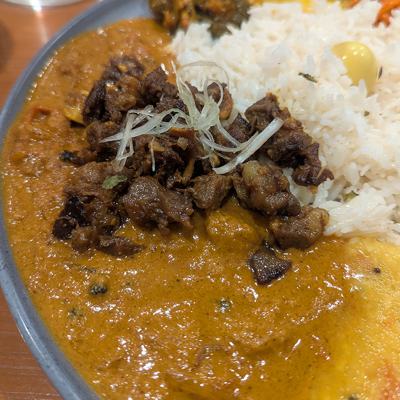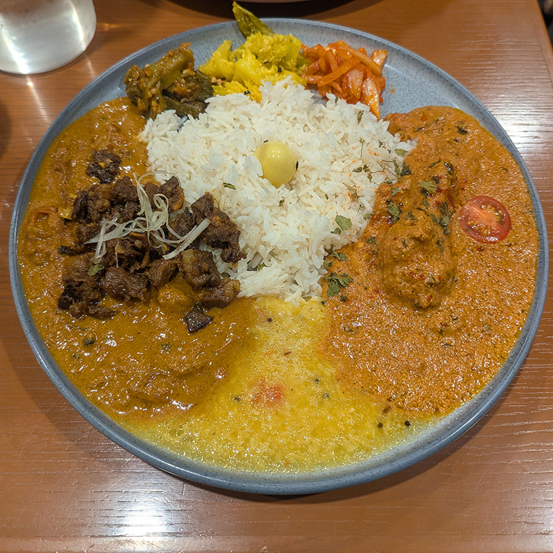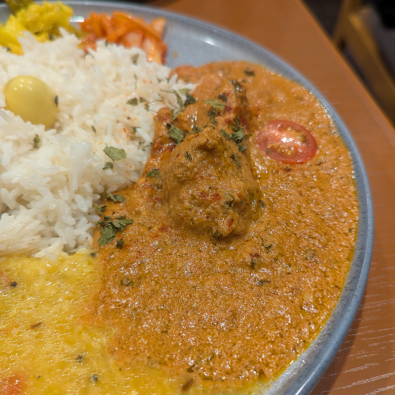 一方のトマトバターチキンは穏やかな甘さとトマトの酸味の優しい味わいだが、しっかりとスパイシー。インド料理の一般的なバターチキンとは明らかに異なるベクトルのバターチキンである。