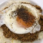 ギュウスジすきやきカレーは牛すじを煮込んでビーフストックにし、上に牛すじとこんにゃくのすきやきキーマが乗る。しっかりとしたコクのある濃い味わいでキーマの甘みとスパイスとのコントラストが面白い。