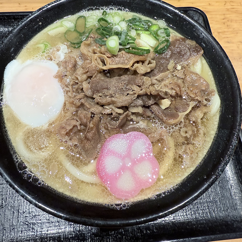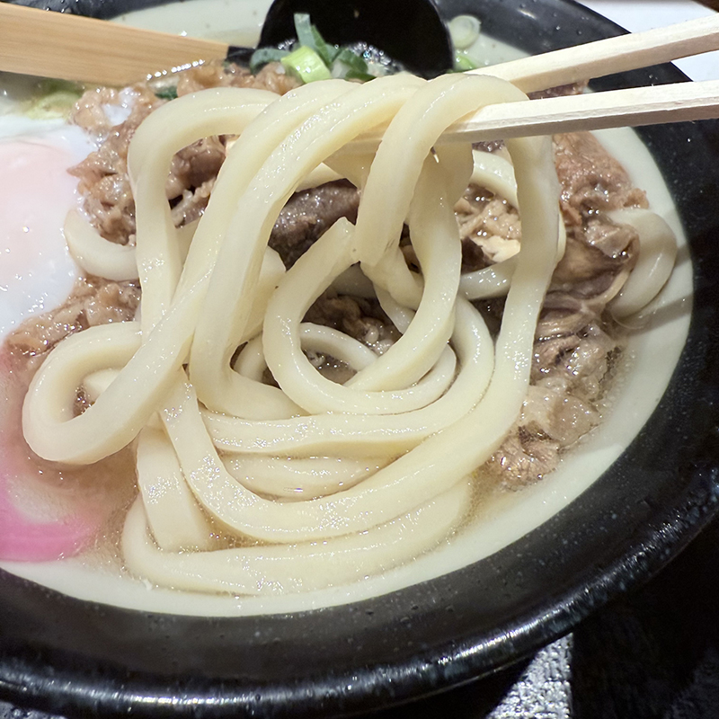 肉うどんには温玉をトッピング。うどんそのものは悪くはないのだが、思ったよりもコシは弱く、喉越しを含めて抱いていたイメージとは異なった。