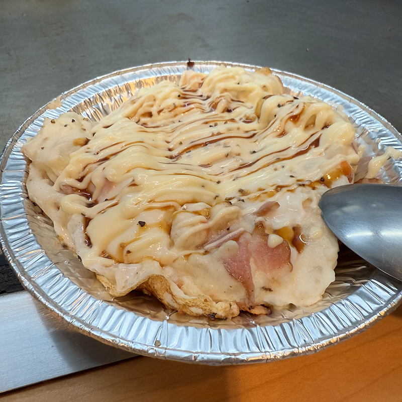続いて、月見ポテトベーコンを初挑戦。メニューには卵、ポテト、ベーコンとそのままの記述。てっきり薄切りのじゃがいもが入るものを想像したのだが、ポテトには何とポテトサラダを使用。源亀らしいジャンキーな美味しさ。