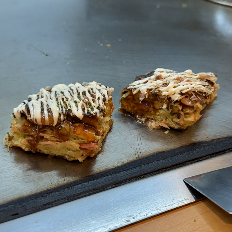 流石にハイカロリーでお腹にたまる料理が続いたため、結構、満腹状態に。本来ならあと1,2品は頼むところではあるが、締めにお好み焼きの海のミックス天をお願いした。