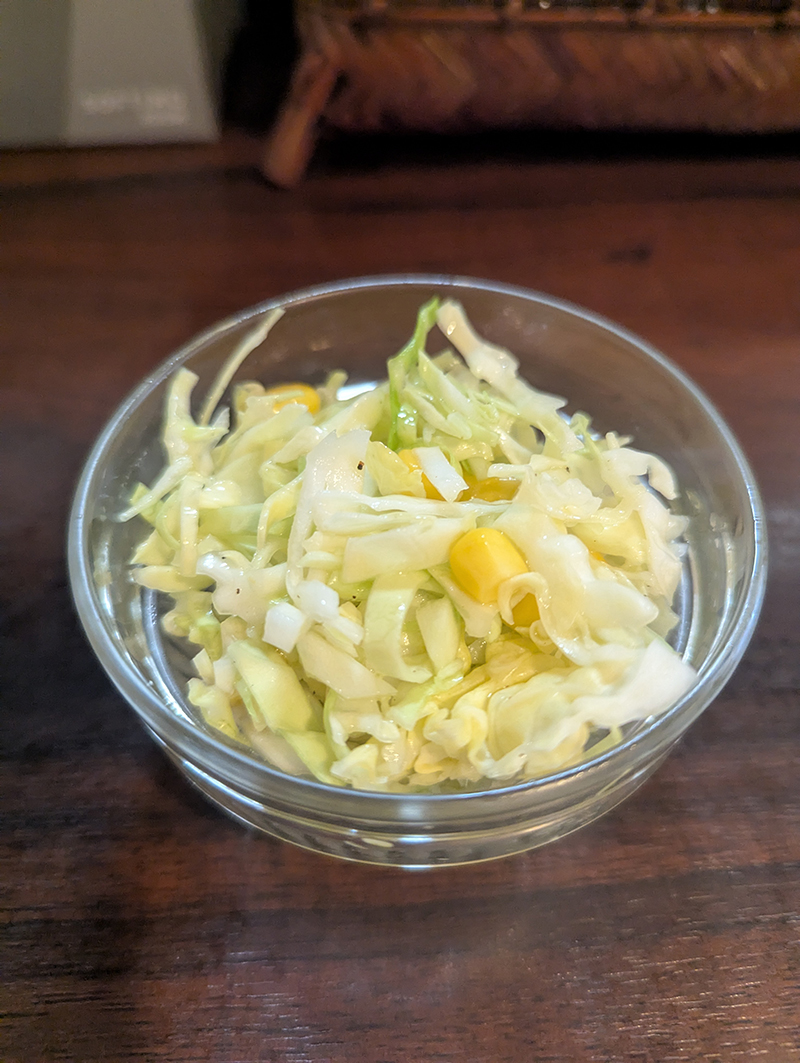 まずはコールスローサラダが供された。ややオイリーだが味のバランスはいい。