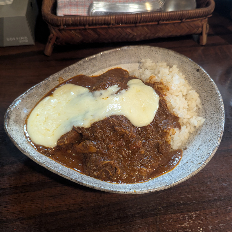無料トッピングにはチーズを。ポークビンダルーと基本的に味のベクトルは同様やや煮詰まった感がある。