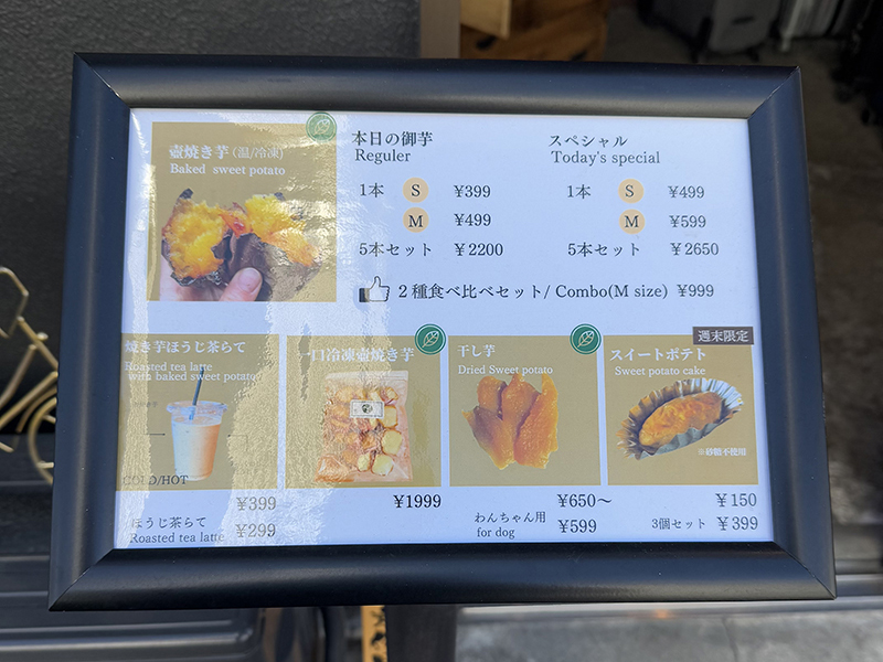 メニューを見ると焼き芋がメインではあるが、他にもスイートポテトやワンちゃん用お菓子など、芋を使ったお菓子が並ぶ。この日の本日の御芋は千葉県産の紅はるか。スペシャルは島根県産のスペシャルはるか。