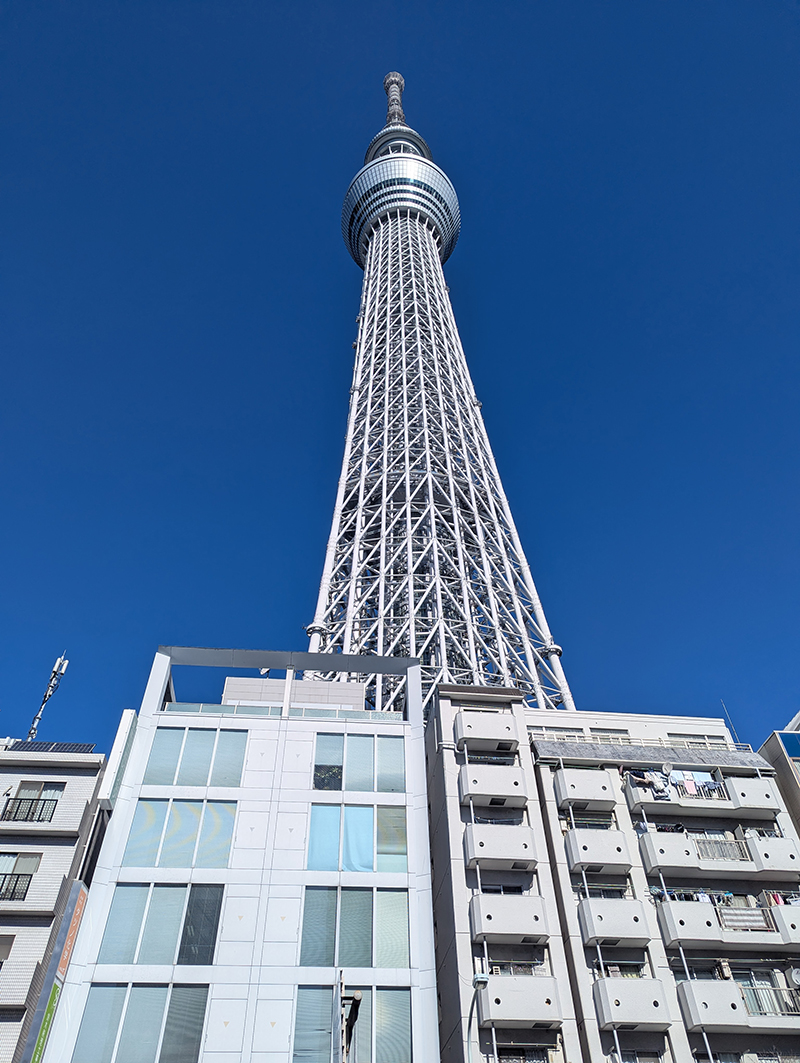 浅草通り沿いにあり、見上げれば目の前には東京スカイツリーが聳える。