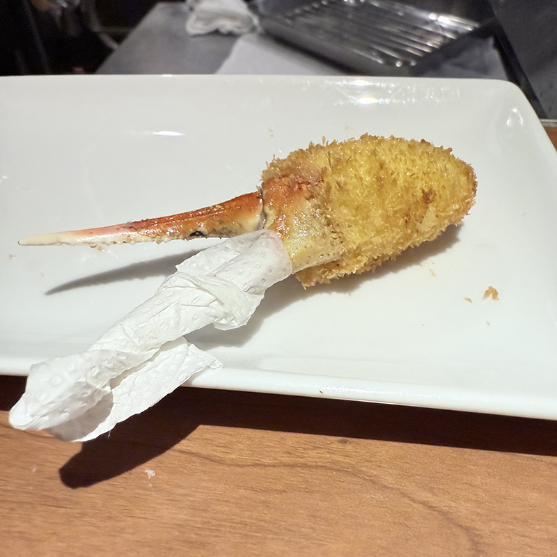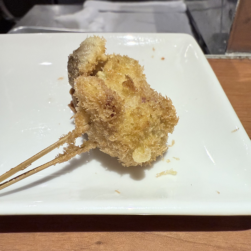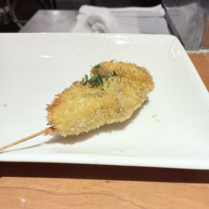 どの串も単に素材そのものを揚げただけでなく、他の食材と組み合わせてひと工夫されているのは前回と同様。これが驚きと発見がある同時に最後まで単調にならず飽きがこない。上は今回初の牡蠣。