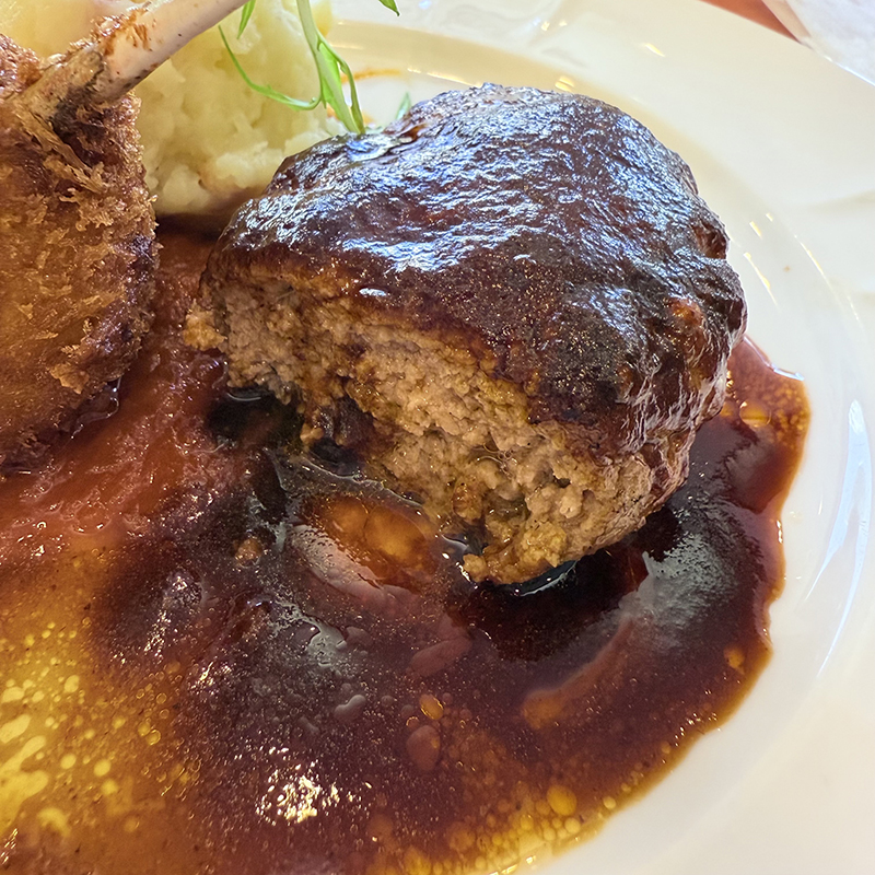 ハンバーグはナイフを入れると肉汁がじんわりと滲む。デミグラスソースの出来もよくバランスがいい。