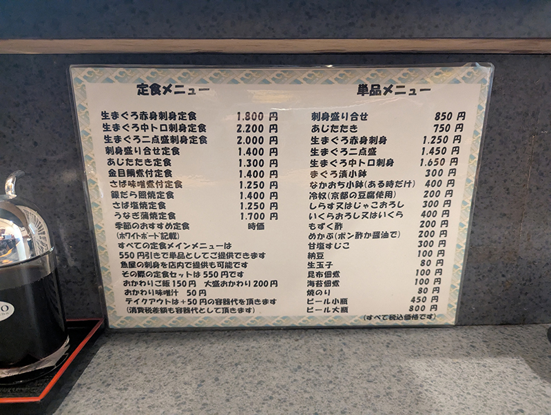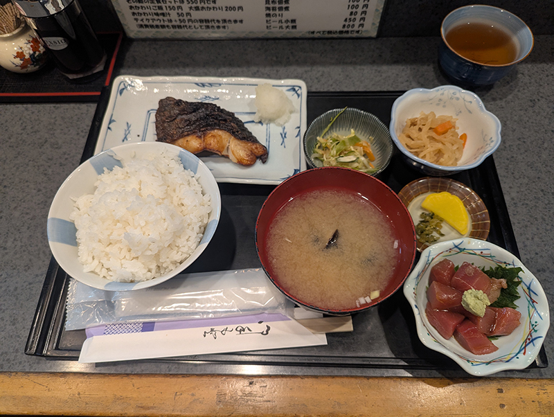 魚屋さんだけあって刺身、焼き魚、煮魚ともに種類が豊富ところがいい。定食に加えて小鉢も充実してる。