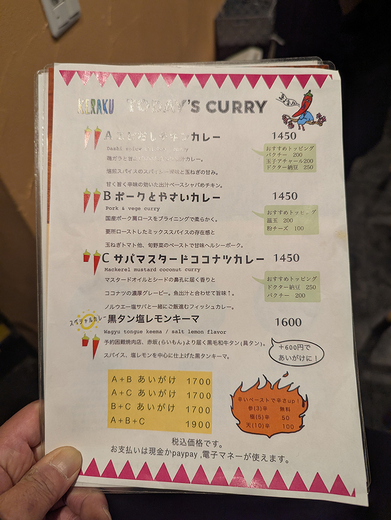 メニューは訪れる度に違うのでいい意味でワクワク感がある。わずか4種類しかないメニューだが、毎回なかなか1つのメニューには決めかねることができない。その結果、最終的にはあいがけになってしまう。