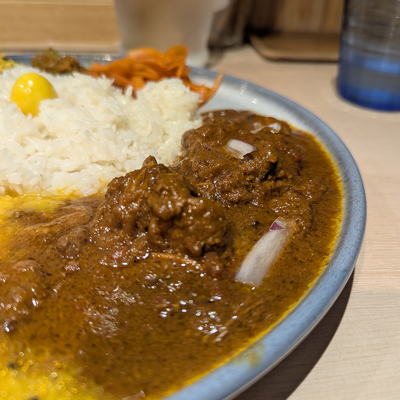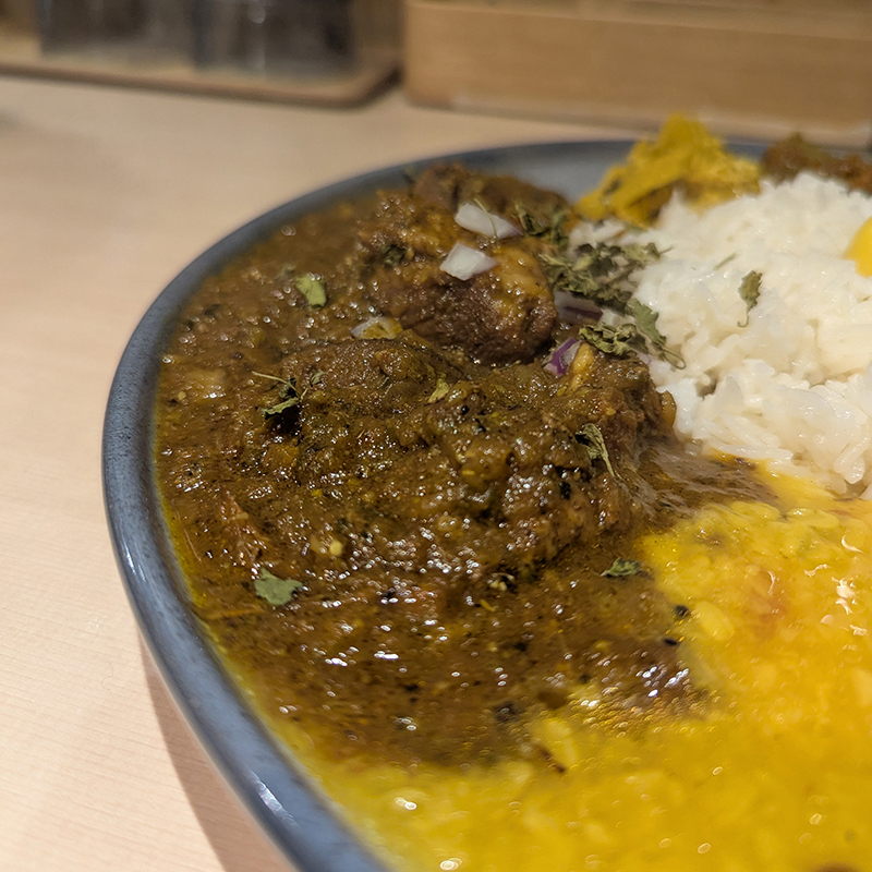 むしろポークカレーの方がコク深く力強い味わい。肉にも味がしっかりとしみている。グローブが効いて、カレーリーフもアクセントになっていた。同じ目黒にあるLANDのポークカレーに近い印象。