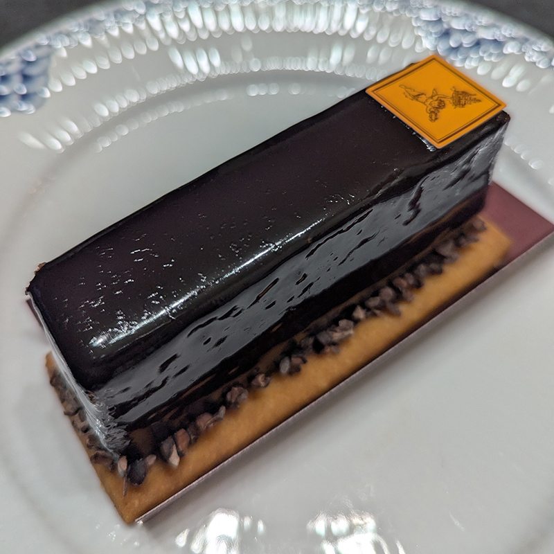 種類の異なるチョコラが層になっていて、最下層のヘーゼルナッツのプラリネが芳ばしくいいアクセントになっている。外側はビターなショコラでコーティングされていて中は口当たり柔らかなムース状に。土台のサブレはバターの香りがしっかりとして全体のバランスがいい。