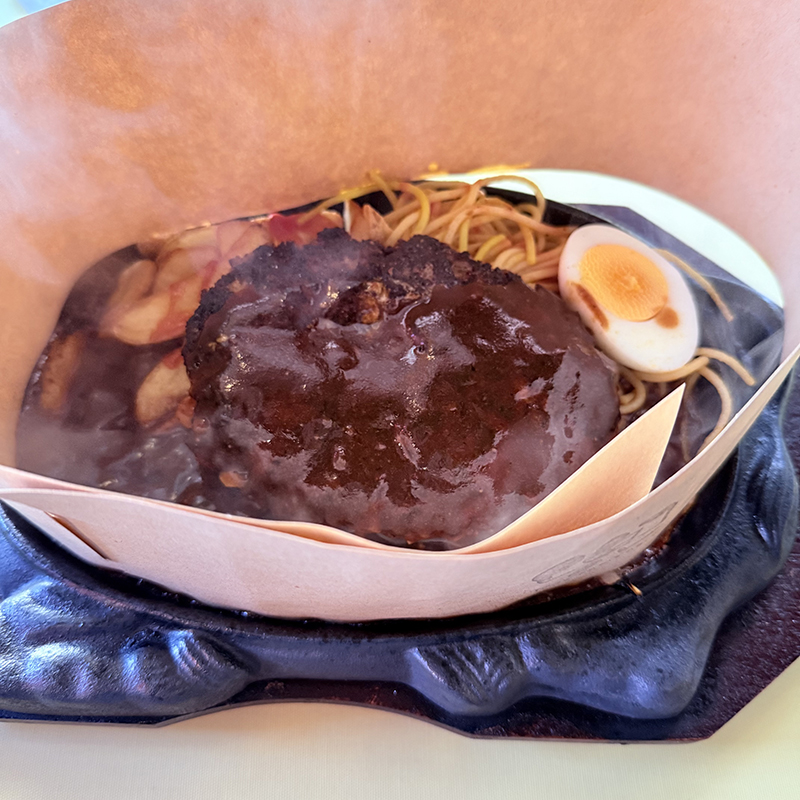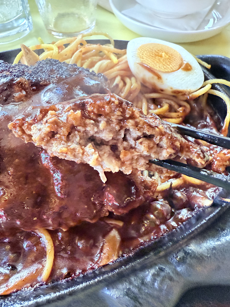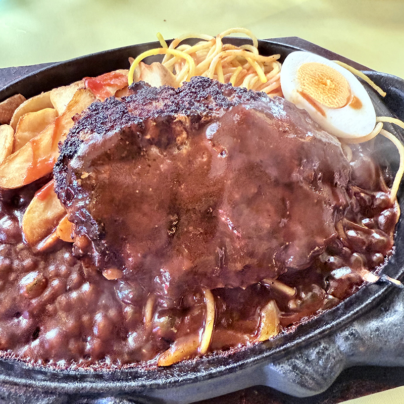 ソースはデミグラスソースというよりはデミグラスソースにウスターソースとケチャップを合わせた様な家庭的な味わい。鉄板がアツアツ過ぎて半分ほど食べ進めるとソースは蒸発してしまう。