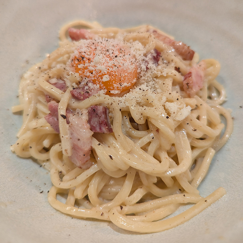 パスタの上に卵黄が乗っていて、これを崩しながら頂くのだが、まずはそのままで。