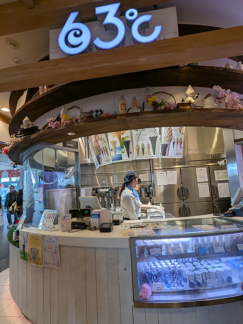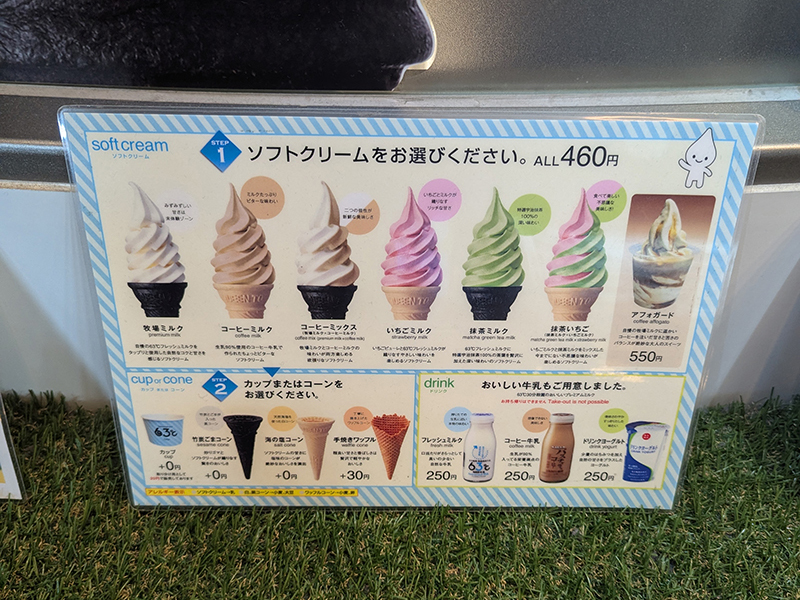 乳製品のドリンクもあるが、基本はソフトクリーム。全部で7種類の中から選び、更にコーンあるいはカップの中から、お好みのものを選択する。