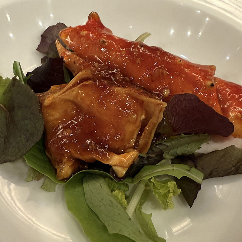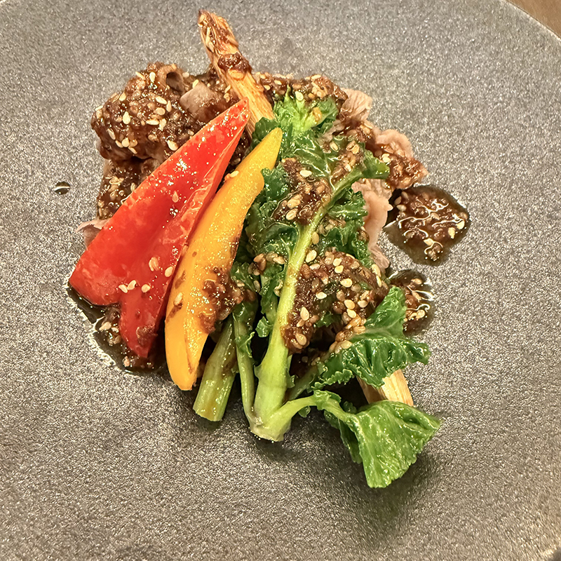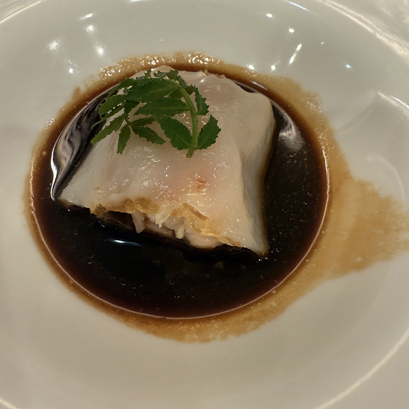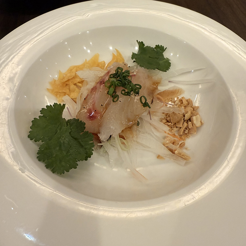 下に敷かれた玉ねぎと添えられたナッツとワンタンの皮のチップと共に鯛そのものの素材が良く、中華風のタレとの相性がいい。ナッツとチップの食感と香ばしさが加わり和食とは全く異なる趣に。