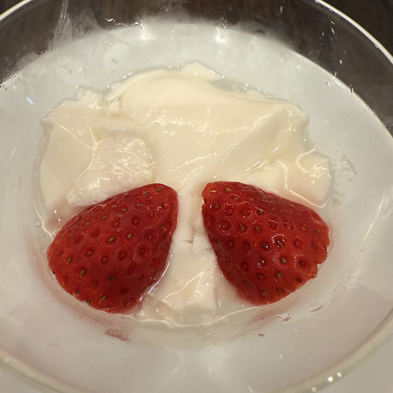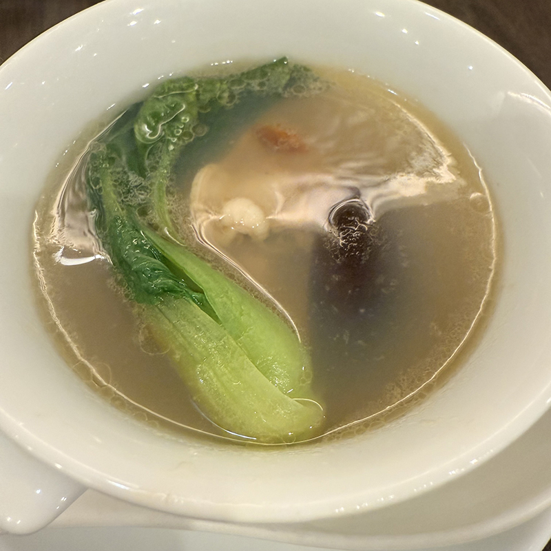 青梗菜、ハマグリ、クコの実が入ったスープ。淡麗で上品な味わいだが、ハマグリの旨味と干し貝柱の旨味がしっかりとしてコクがある。