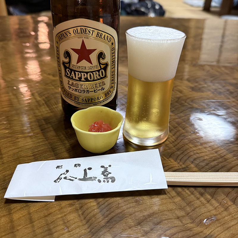 この日は暑いくらいの陽気だったので、ビールで喉を潤す。ビールは赤星。お通しには紅梅が供された。