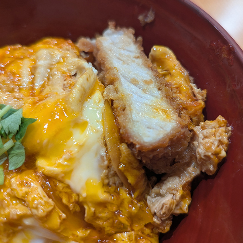 いかにも良質そうな玉子の黄身がトロリとかつを覆う。そして玉子が掛かっていない部分の揚げ加減もよさそうで見た目にも美しい。いがいとポーションは小ぢんまりとしている。