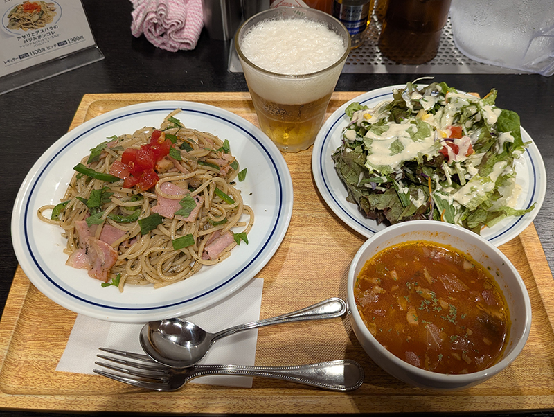 何となく有楽町の「ジャポネ」と似たイメージを持っていたお店だったので醤油バジリコを。サラダとスープのセットにした。後はビールを。