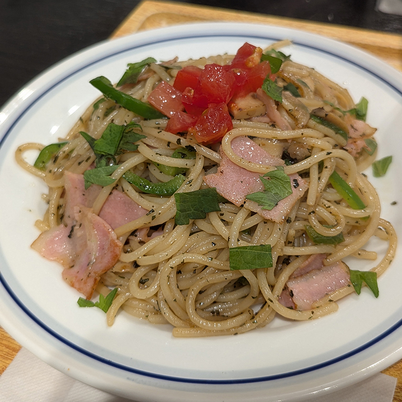 ジャリコに比べるとやや上品な面持ち。具材はベーコン、大葉、バジリコ、マッシュルーム、ピーマン、トマト、玉ねぎが入る。スパゲティは柔らかめながらもっちりとした食感。比較すると前者に軍配では上がるが、それとなくエッセンスを感じることができる。