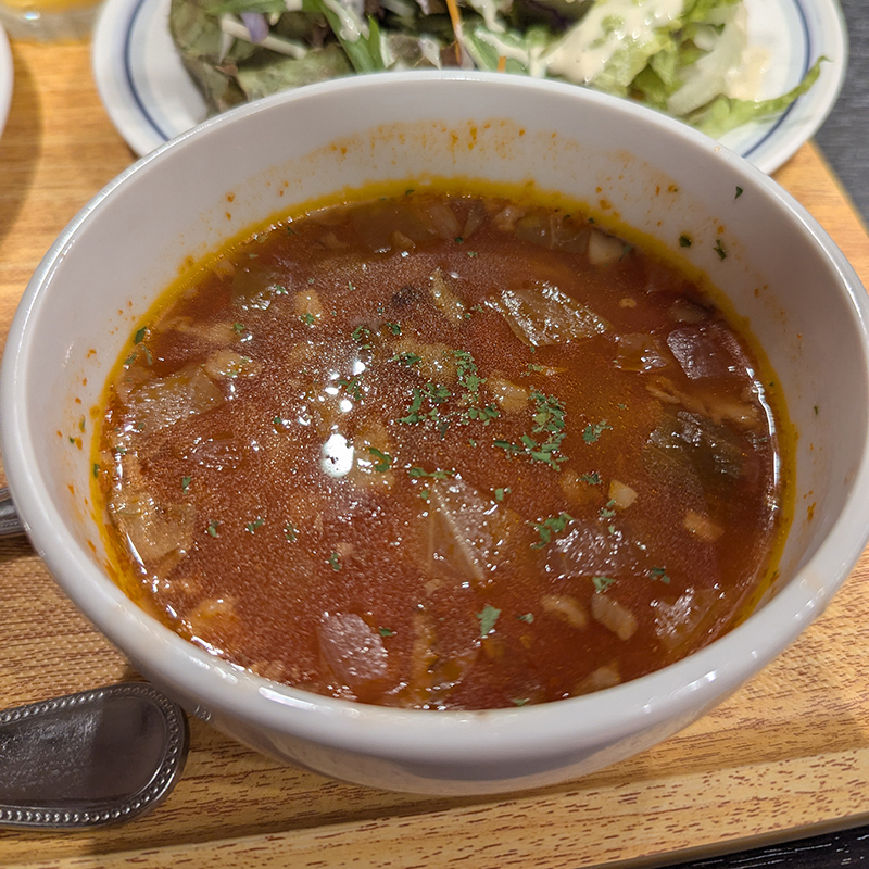スープはトマトのスープで想像以上にちゃんとしている。サラダと両者合わせて300円なら納得がいく。