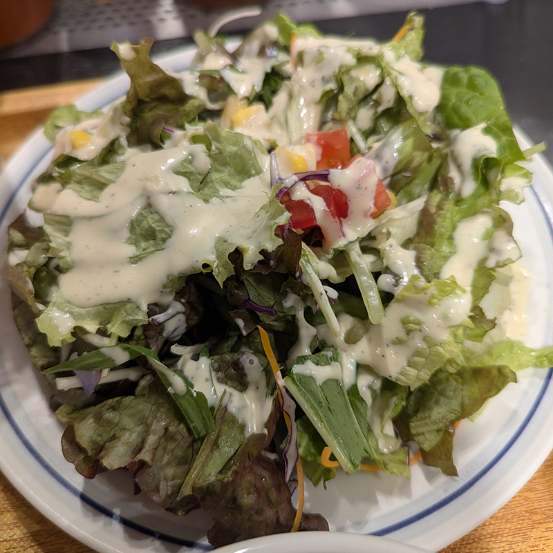 サラダとスープのセットがプラス300円なのだが、値段を考えるとこちらもかなりのボリュームだ。サラダはシーザーサラダでドレッシングもまずまず。