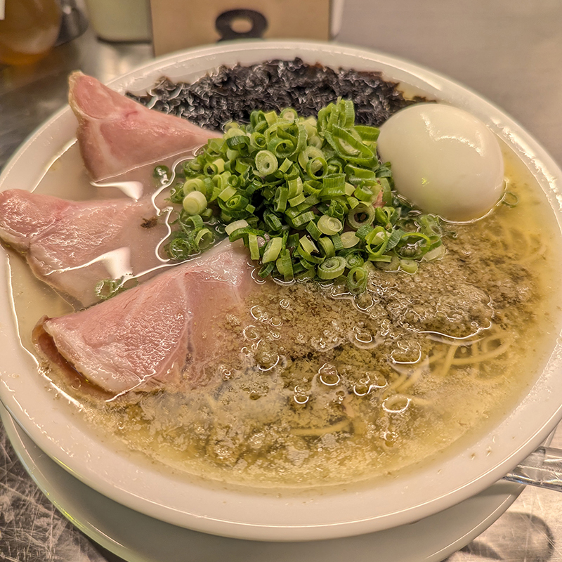 まずはスープ。磯の香りに包まれて塩味はしっかり。このラーメンの世界観を支えるのはなんと言ってもアヒージョ。そして岩のりもいいアクセントに。