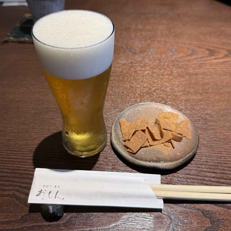 まずはビールをお通しには前回同様、揚げ蕎麦。前回は柔らかかったのだが、今回は少し固め。
