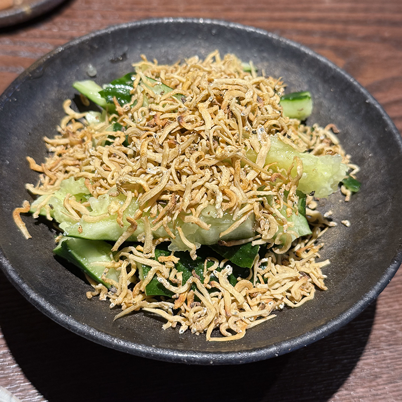 肴にはおつまみメニューの先頭を飾るじゃこ胡瓜を。予想通り提供は早い。素揚げにしたじゃこが盛り沢山でこのスタイルは想定外。じゃこの食感と芳ばしさがいいアクセントになっていた。