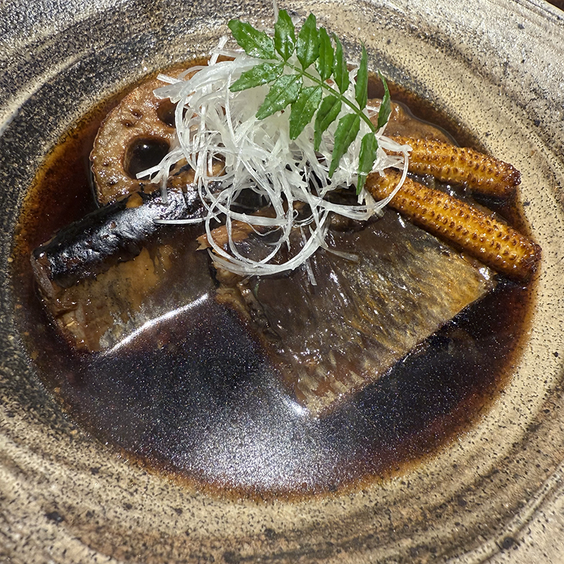 箸を通すとスッと通るほど柔らかく、味付けもいい塩梅で辛すぎない上品な仕上がりでお酒のアテには好適。付け合せにはヤングコーンと蓮根が添えられている。