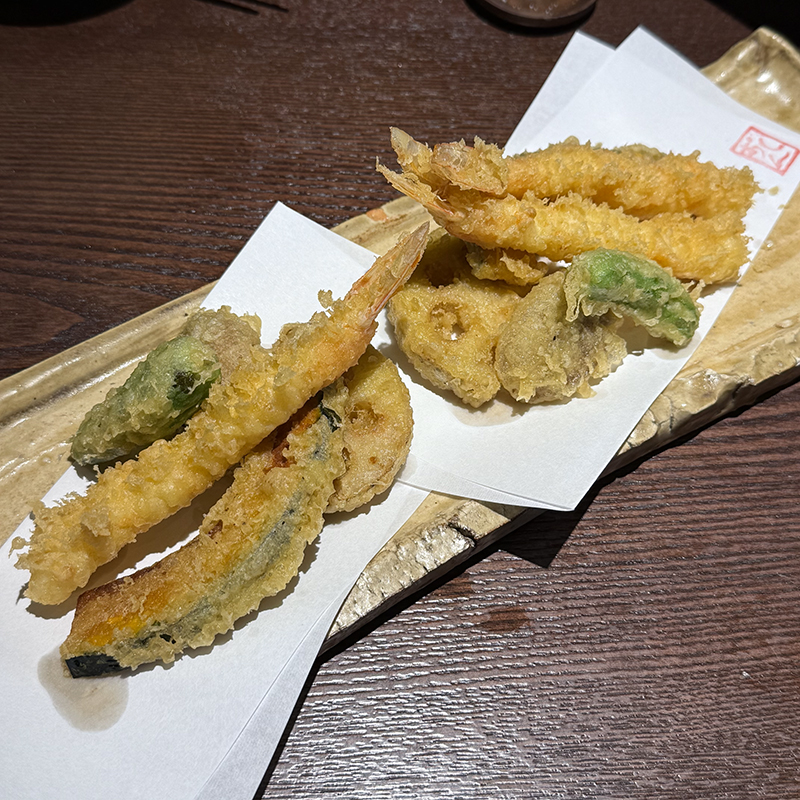海老、椎茸、獅子唐、蓮根、南瓜という内容。蕎麦屋の天ぷらとして衣は薄めでサクサクと程よい食感に揚がっている。